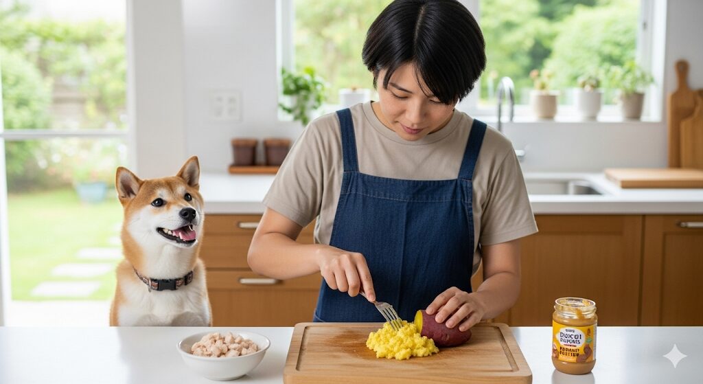 さつまいもを柔らかく茹でて、潰すだけでペースト状のおやつが作れます。ペーストは、そのまま与えたり、ドッグフードに混ぜたり、凍らせてシャーベットにしたりと、様々な用途で使えます。特に、食欲がない時や水分補給をさせたい時に便利です。